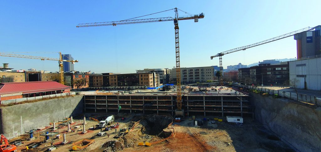 “We have deployed five tower cranes on the site to fast track the project, ensuring the safe movement of steelwork, formwork and other construction material,” says Muller. Readymix concrete is being used for the in-situ construction of post-tensioned slabs, with space at a premium due to the busy urban location.