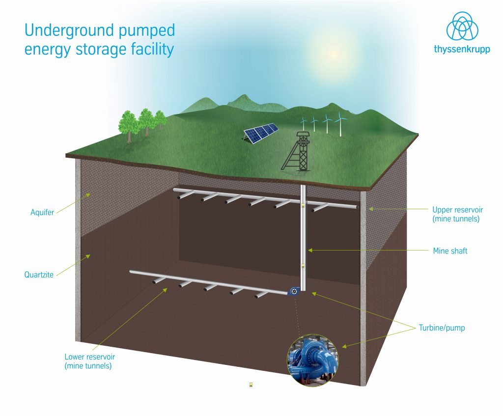 Underground pumped energy storage utilises development mining tunnels, previously used to access the gold reefs, as upper and lower reservoirs which will enable energy storage and generation. When excess electricity from renewable or other sources, is available, water is pumped to the upper reservoir. When the electricity is required the water discharges from the upper reservoir to the lower reservoir under gravitational force, generating electricity through a generator coupled to a turbine in the shaft system.