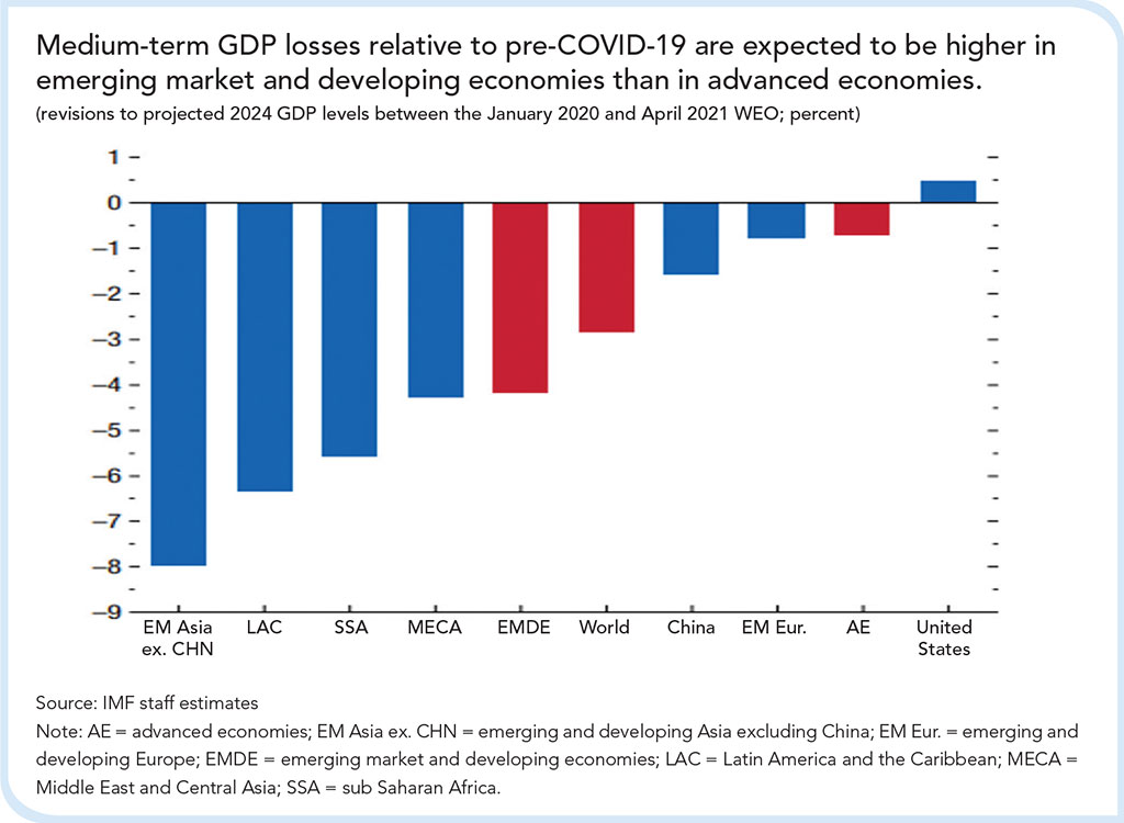 The divergent performance between emerging and developed economies serves to highlight another important feature of the Covid-19 recovery: its unevenness. It should be noted that around 75% of the approximate $17 trillion in fiscal support was deployed by the major economies of the G-7 (Canada, France, Germany, Italy, Japan, the UK, and the US). These countries were also amongst the first to have access to vaccines. Unsurprisingly, their recoveries have been far more robust and their future prospects brighter. Chart 2 highlights the greater losses which emerging and developing countries are expected to incur as a result of the crisis.