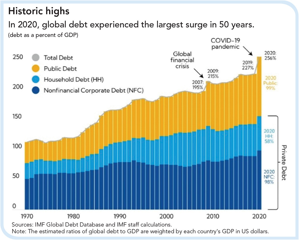 In response to the surge in inflation, the bond market is now pricing in the first US rate hike in March 2022 – approximately 24 months after the last interest rate cut and many months earlier than had been anticipated at the beginning of 2021. Significantly, it took approximately seven years (3x longer) before interest rates started to rise after the 2008 Global Financial Crisis. Considering the huge amount of debt globally, it isn’t likely to take many interest rate hikes before higher rates start to weigh on growth. Chart 3 highlights how global debt surged to historic highs during the pandemic.