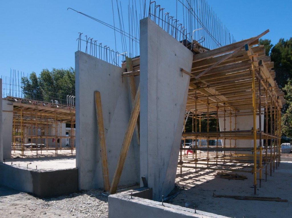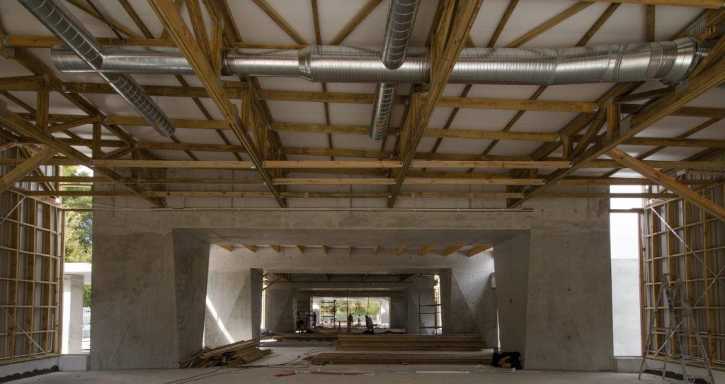 In addition, eight 15m x 2m (height) in-situ beams were cast on either side of the four concrete roof slabs to support four wooden truss assemblies for the Zincalume roofing and its ceilings.