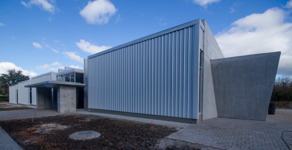 The precast structures were used to secure the building’s timber-framed walling and other construction elements. It was clad with Zinacalume aluminium roof sheeting which was also used for the roofing above each of the four exhibition bay sections and the central reception area.